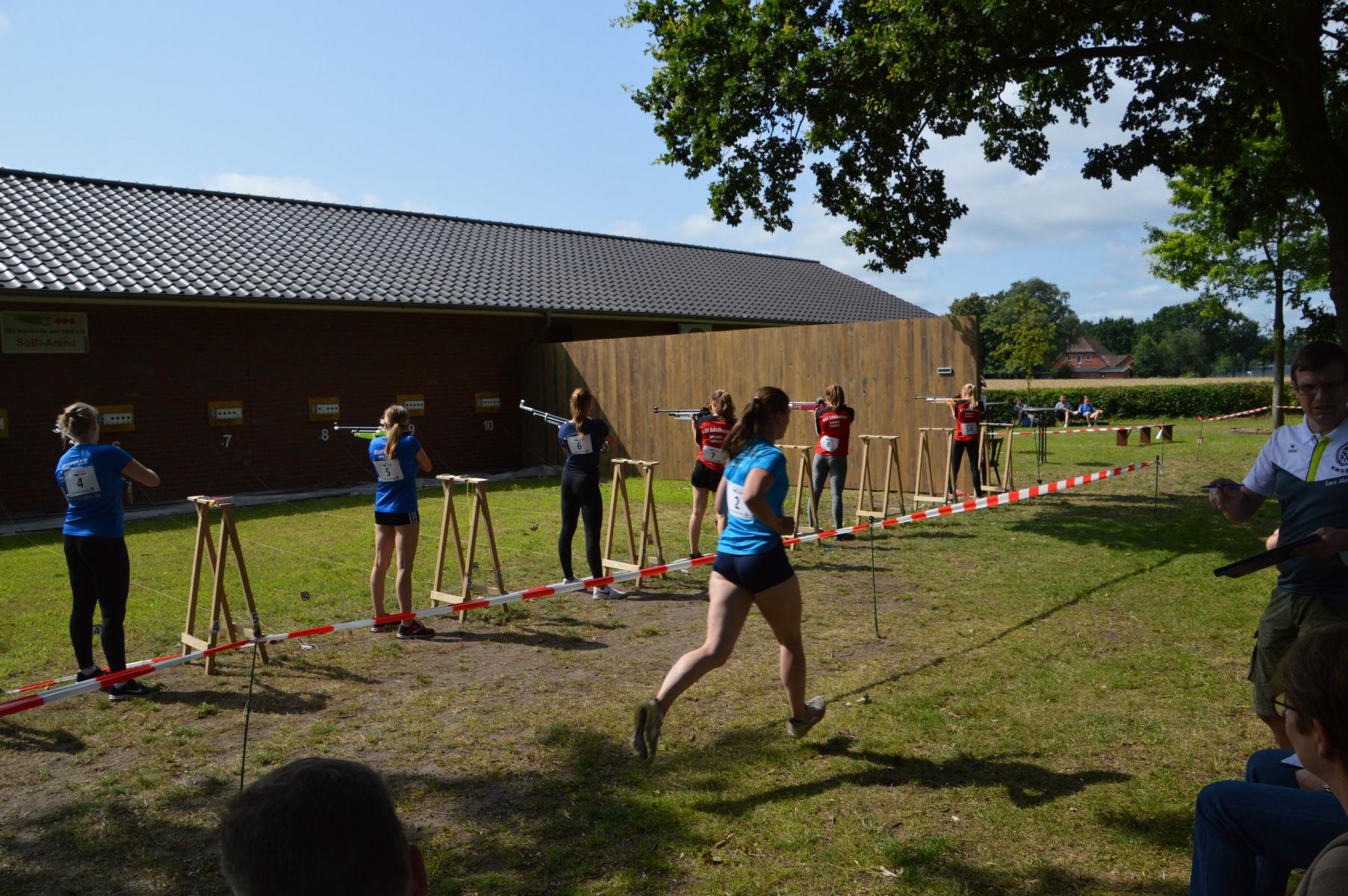 So konnten den Zuschauern auch spannende Wettkämpfe geboten werden, in der Klasse der Juniorinnen gewann Eske Timmermann vom SSV Adelheide in einem packenden Schlusssprint nur einen Wimpernschlag vor Christina Bagunk vom SV Neuhaus-Carrenzien. Den dritten Platz belegte Nele Stöckmann ebenfalls vom SV Neuhaus-Carrenzien. Auch in der Damenklasse betrug der Vorsprung von Elena Ruge nur drei Sekunden auf ihre Schwester Anika Ruge (beide SSV Adelheide). Hier belegte Sophie Harbers vom SV Aschhausen den dritten Platz. In der Herrenklasse gewann Bastian Günnemann vor Janko Siegert (beide SSV Adelheide). Der Dritte Platz ging an Heiko Jabusch von den Oldenburger Schützen, der auf eigenen Wunsch in der höheren Klasse angetreten ist. Etwas Pech hatte Fabio Brockmann (SSV Adelheide) der sich nach einem Waffendefekt mit dem dritten Platz begnügen musste, nachdem er sich zuvor auf Landesmeisterschaft der NSSV in seiner Klasse noch den Gesamtsieg u.a. gegen einen Bundeskaderschützen sichern konnte. Bei den Junioren gewann sein Vereinskollege Timm Jacobs vor Marcel Kukula (KKSV Wendisch Evern). In der Klasse der männlichen Jugend gewann Dorian Wessels (SSV Adelheide) vor Fabien Tuschar (SV Sandkrug) gefolgt von Jakob Wulf (SV Neuhaus-Carrenzien). Weiter Ergebnisse und Zielzeiten siehe Internetseiten des NWSDB.