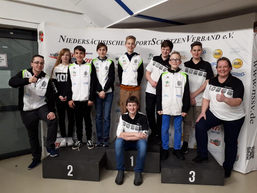 Mit der Luftpistole belegte die erste Mannschaft mit Sina Nicoley (174 Ringe), Fiete Pohl (170 Ringe) und Florian Opitz (168 Ringe) den zweiten Platz und die zweite Mannschaft mit Jennifer Wingert (166 Ringe), Maximilian Töpperwien (165 Ringe) und Ben Nannemann (161 Ringe) den dritten Platz. In den Einzelwertungen belegten Sina Nicoley und Fiete Pohl die Plätze eins und drei. Als Einzelschützen komplettierten mit Luc Barmbold (159 Ringe) und Sören Meinking (152 Ringe) zwei weitere Schützen das starke Mannschaftsergebnis. „Alle Schüler haben ihr Leistungsvermögen abrufen können oder sogar über oder in die Nähe ihre Bestleistung schießen können“, so Quell und Löhmann zufrieden.
